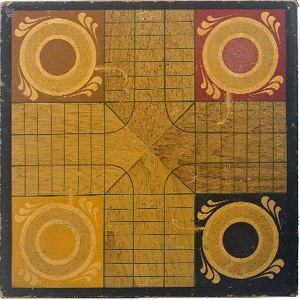 These are antique board games. The circles, lines and colour are mainly there because of the rules of the game. The worn paint wearing off the wood gives them a feel of a Russian Icon or evan a later work by Frank Stella.